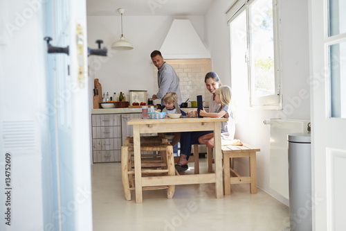 © Monkey Business, Fototapeta premium Kids at kitchen table with mum, dad cooks, view from doorway
