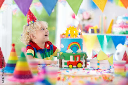 © famveldman, Fototapeta premium Kids birthday party. Child blowing out cake candle