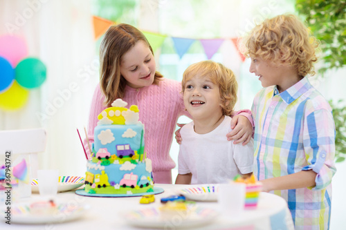 Fototapeta premium Kids birthday party. Child blowing out cake candle