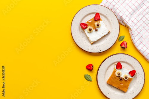 Obraz premium Kids breakfast with fox faces sandwiches made from peanut butter and strawberries