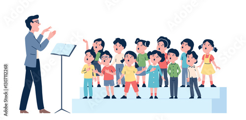 Obraz premium Kids choir. Singing lesson with teacher, musical school students or vocal competition talents. Children sing song together, music recent vector characters
