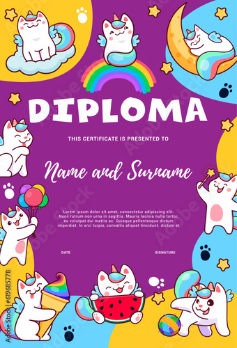 Fototapeta premium Kids diploma, cartoon cute caticorn cats and kitten characters, vector...