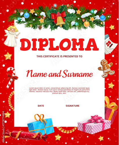 © Vector Tradition, Obraz premium Kids diploma for Christmas holidays, decorated with cartoon festive garland of pine branches gifts, candy cane, gingerbread man and Xmas holiday gold bells. Vector Christmas kids diploma award