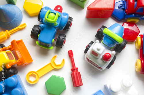 © Roman Motizov, Obraz premium Kids educational developing toys frame on white background. Top view. Flat lay. Copy space for text