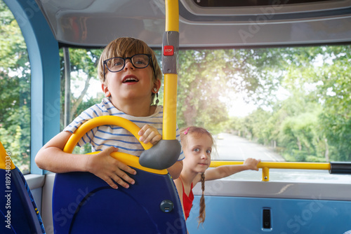 © Sergey Novikov, Naklejka premium Kids enjoy a double decker bus ride through beautiful scenery