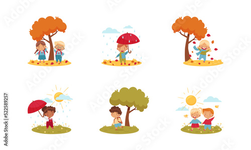 Naklejka premium Kids Enjoying Autumn and Spring Season Walking Outdoor Vector Set.