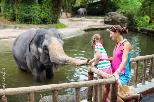 © famveldman, Fototapeta premium Kids feed elephant in zoo. Family at animal park.