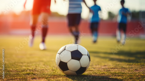 Fototapeta premium Kids football - young children players match on soccer field, Banner