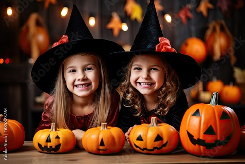 Fototapeta premium Kids in Halloween Hats, Happy Little Girls Smile, Halloween Celebration,...