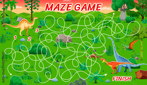 Fototapeta premium Kids labyrinth maze game, help to dinosaur find the exit puzzle quiz vector worksheet. Cute dinosaurs maze game with labyrinth and cartoon titanosauria, monolophosaurus and tapejara dino characters