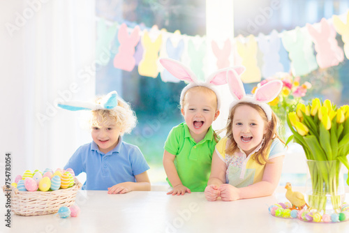 Fototapeta premium Kids on Easter egg hunt. Children dye eggs.