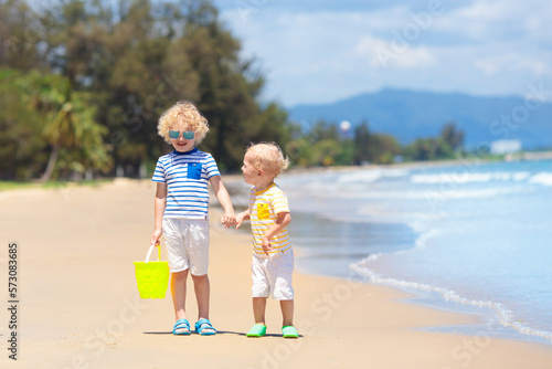 Fototapeta premium Kids on tropical beach. Children playing at sea.