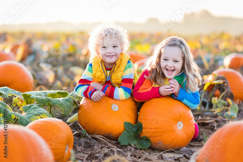 Obraz premium Kids picking pumpkins on Halloween pumpkin patch