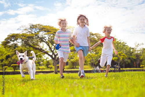 © famveldman, Obraz premium Kids play with dog. Children and puppy run in park