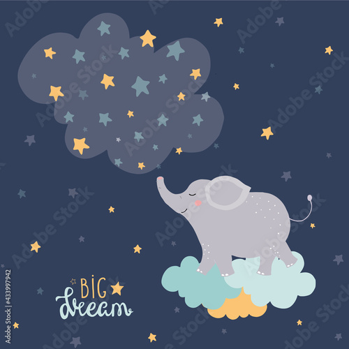 © ALENA, Obraz premium Kids poster cute character elephant flies on the clouds and stars. Text big dream. Kids wallpaper. Сhildren's print art. Dark night, yellow stars, blue clouds. Vector illustration. Doodle style.