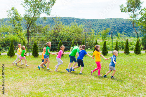 Fototapeta premium Kids running holding hands at the lawn