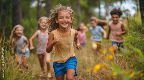 Obraz premium Kids running through the forest, playing tag, laughing, and enjoying the freedom of outdoor play surrounded by nature