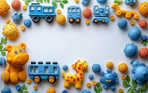 Naklejka premium Kids Toys Frame on White Background: Top View Flat Lay with Copy Space