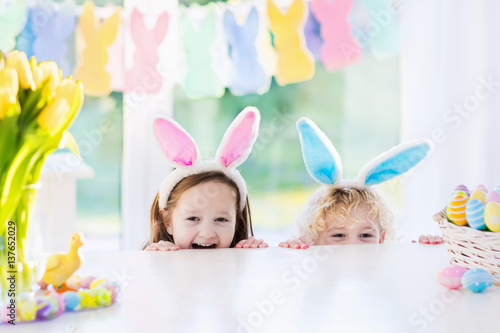 Fototapeta premium Kids with bunny ears on Easter egg hunt