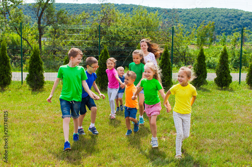 © oksix, Obraz premium Kids with tutor have fun and go to the playground