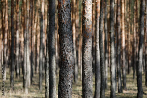 Obraz premium Kiefern Wald mit vielen Bäumen und Baumstämmen