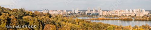 © Alexey Wraith, Naklejka premium Kiev, Ukraine, autumn panoramic view of the slopes of the Dnieper, the Dnieper river and various buildings on the river bank