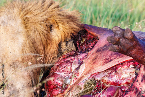 © Lars Johansson, Naklejka premium Killed Hippopotamus with a Eating Lion