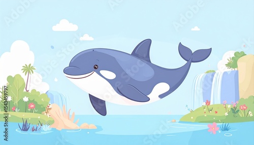 Naklejka premium Killer whale, A cartoon whale swims joyfully in a colorful, vibrant landscape with waterfalls and tropical plants.
