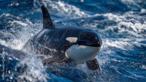 © Maksym, Obraz premium Killer whale approaching with mouth slightly open, splashing water creating dynamic motion, clear sunlight on wet skin