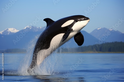 © juliars, Fototapeta premium Killer whale leaps from calm sea water with mountains in background