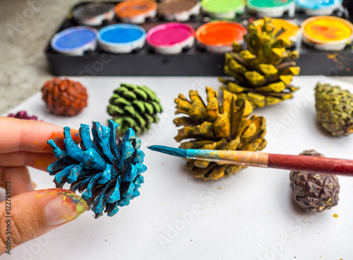 Fototapeta premium Kind malt Kiefernzapfen an