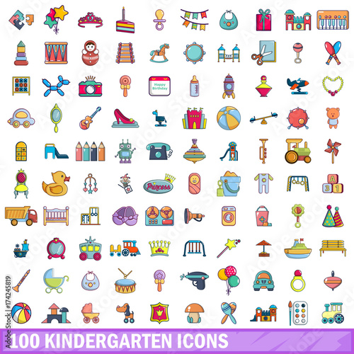 Fototapeta premium 100 kindergarten icons set, cartoon style