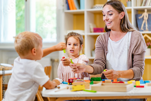 Fototapeta premium Kindergarten teacher playing together with children in the colorful preschool...