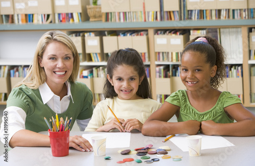 Fototapeta premium Kindergarten teacher sitting with students in art class