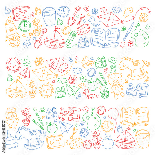 Fototapeta premium Kindergarten with toys. Pattern for children. Little preschool kids education. Drawing, learning, play