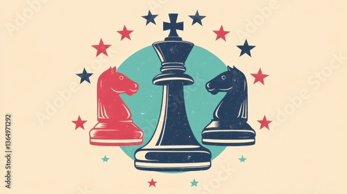© Andrei, Fototapeta premium King and knights chess pieces facing each other with stars background