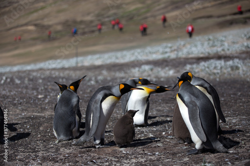 © Grantat, Fototapeta premium King Penguin (Aptenodytes patagonicus) feeding a chick, Saunders Island.