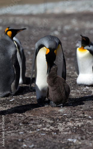 Fototapeta premium King Penguin (Aptenodytes patagonicus) feeding a chick, Saunders Island.