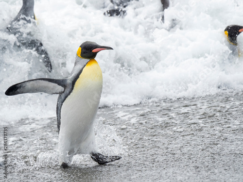 Fototapeta premium King Penguin (Aptenodytes patagonicus) on the island of South Georgia, the rookery on Salisbury Plain in the Bay of Isles. Adults coming ashore.
