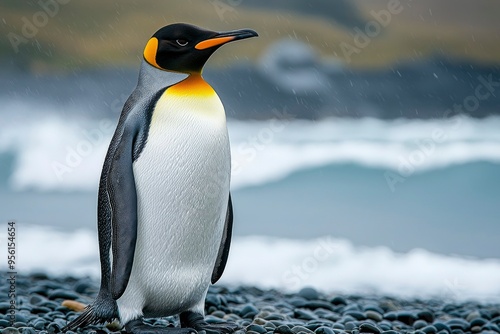 © talkative.studio, Fototapeta premium King Penguin Standing on a Pebbled Beach in the Rain