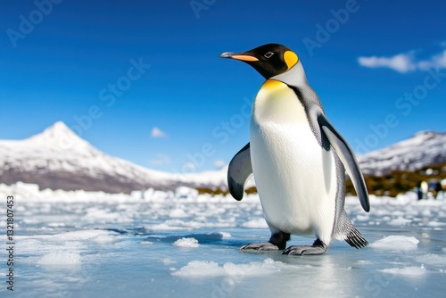© ЮРИЙ ПОЗДНИКОВ, Fototapeta premium King penguin walking on ice in antarctica with snowy mountains in background