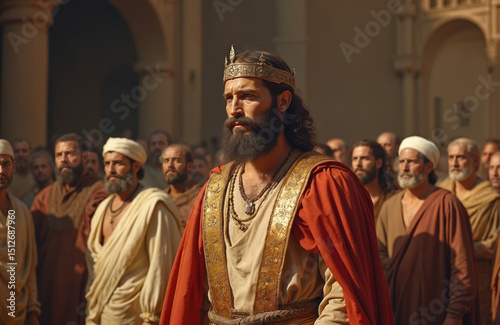 Naklejka premium King Solomon biblical figure famous for wisdom, wealth, influence. Depicted in regal attire, wears gold crown, surrounded by people. Symbol of leadership, historical representation royalty, monarch.