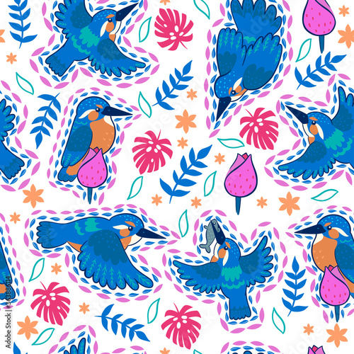 © Екатерина Зирина, Fototapeta premium Kingfisher seamless pattern on white background. Vector graphics.