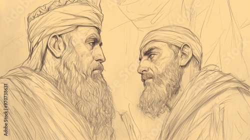 Fototapeta premium 1 Kings Art: Solomon Contemplating the Queen of Sheba’s Visit, Wisdom and Wealth Exchanged, Biblical Illustration on Beige Background for Bible Wall Art