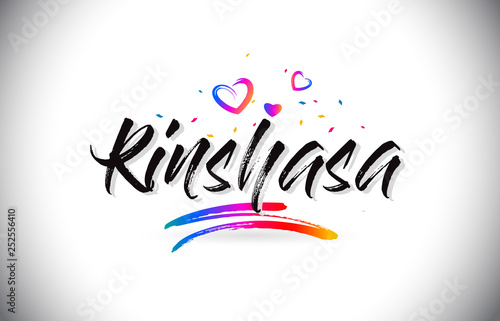 Obraz premium Kinshasa Welcome To Word Text with Love Hearts and Creative Handwritten Font...
