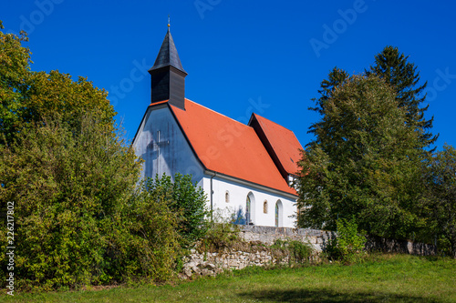 Fototapeta premium Kirche der ehemaligen Gemeinde Gruorn im Biosphärenreservat Münsingen auf der Schwäbischen Alb