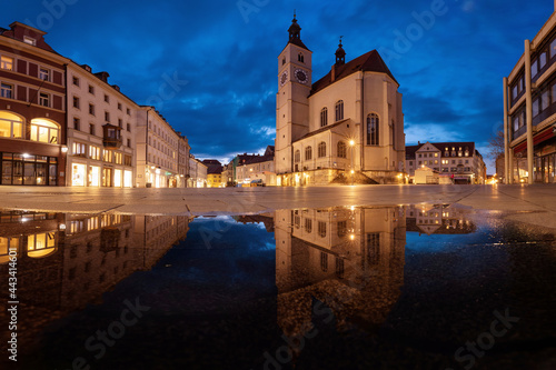© Thomas, Fototapeta premium Kirche Neupfarrplatz zur blauen Stunde mit Spiegelung in einer Wasserpfütze