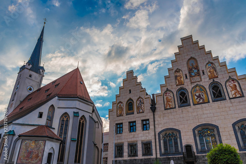 © driendl, Naklejka premium Kirche und Rathaus in Wasserburg am Inn