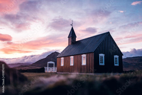 © hoch3fotografie, Fototapeta premium Kirche vor dramatischem Bergpanorama Island