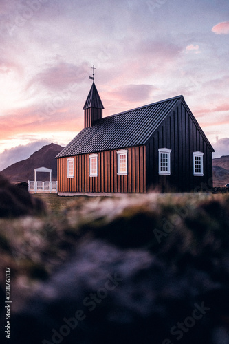 © hoch3fotografie, Fototapeta premium Kirche vor dramatischem Bergpanorama Island